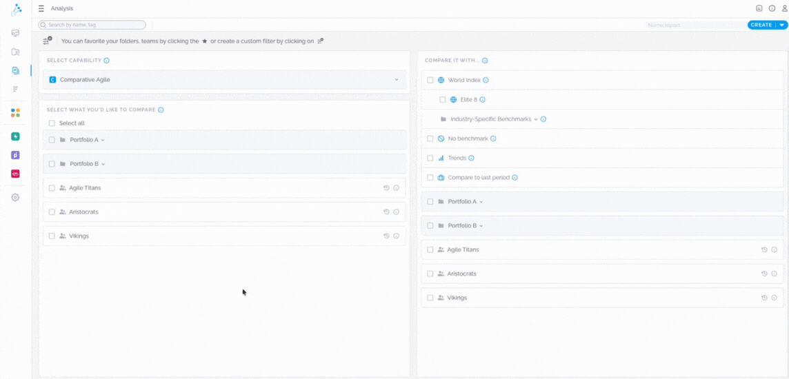 The Analysis screen in Comparative Agility is a powerful tool that enables you to generate actionable reports and gain valuable insights from your data. This article provides an overview of the features and functionalities available on the Analysis screen, empowering you to compare performance, identify trends, assess progress, and create or preview reports.