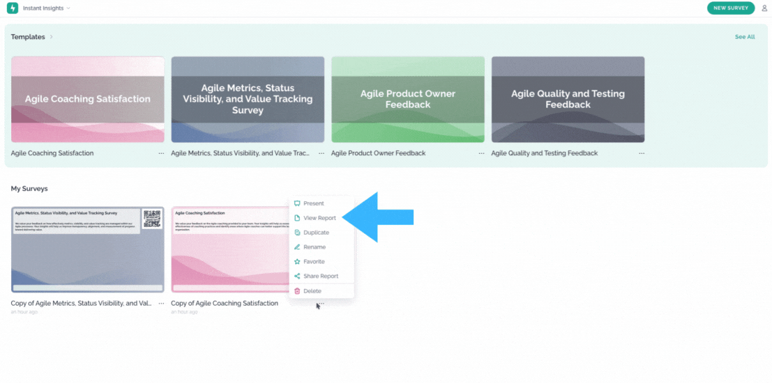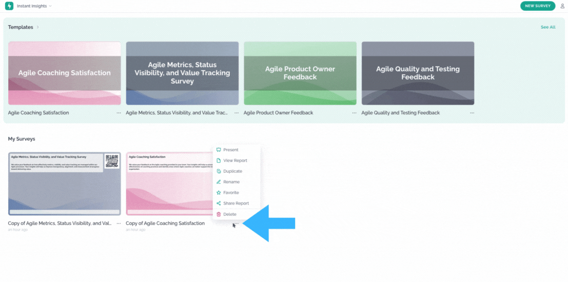 The main screen offers a variety of options. In addition to creating a new survey, you can click on the three dots under any survey you’ve created to access additional actions. These include presenting the survey, viewing the report, duplicating it, renaming it, sharing the report, or deleting the survey entirely.