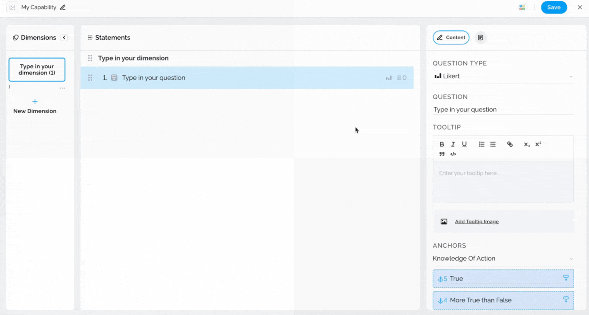 Clicking on the + icon gives you the option to create a new statement. After entering your statement, you will be presented with the same set of options available for all other statements, such as question typetooltips, anchors, and recommendations. We will cover each of these later in the article.