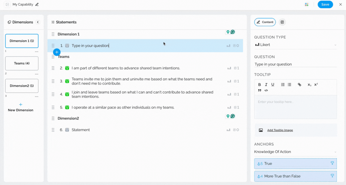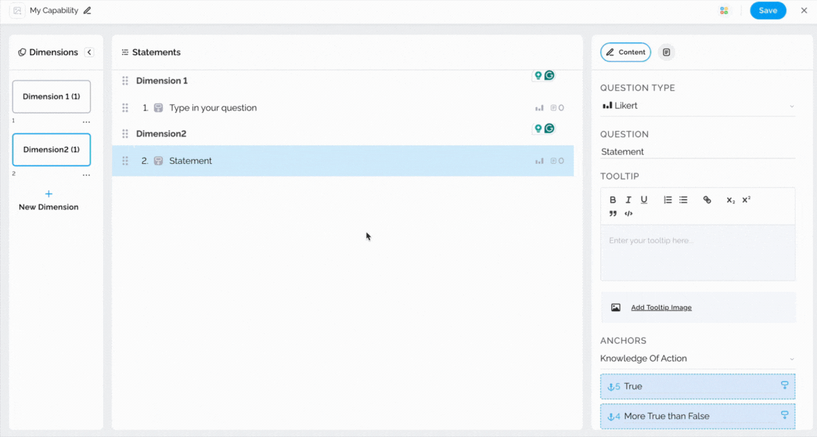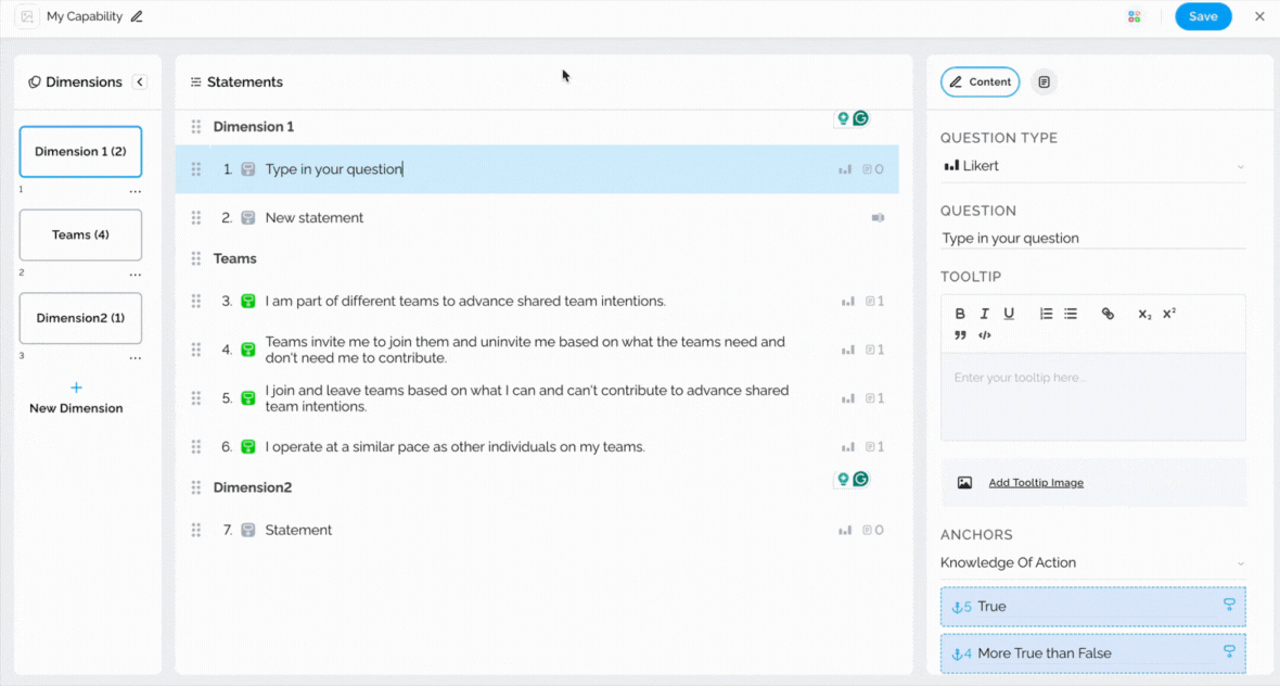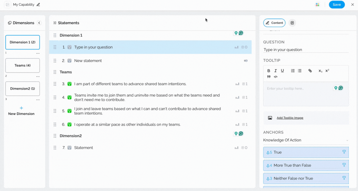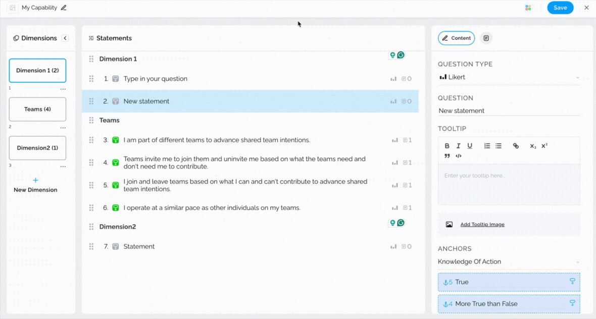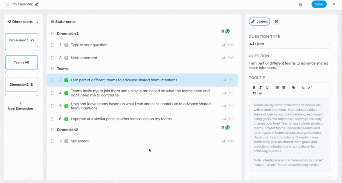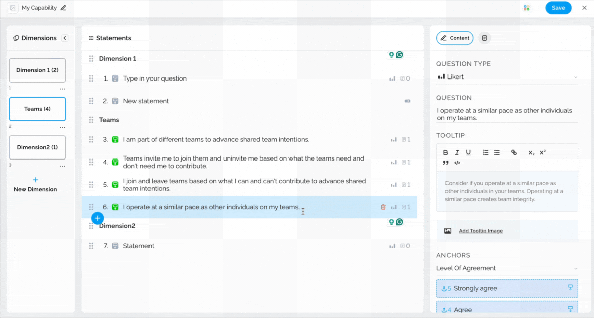 Tooltips can be utilized to provide additional information about statements to survey respondents, thereby enabling them to answer questions more accurately. To add a tooltip, simply select the statement and type in the necessary information on the right-hand side.
