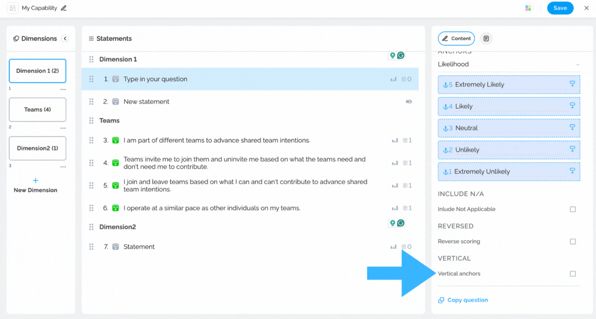 With the Anchors option, you will be able to modify the statement’s possible responses. You can select from predefined responses or add your own custom response. Additionally, this option allows you to enable or disable the ‘Not Applicable‘ choice, which is commonly used in our standard surveys.
